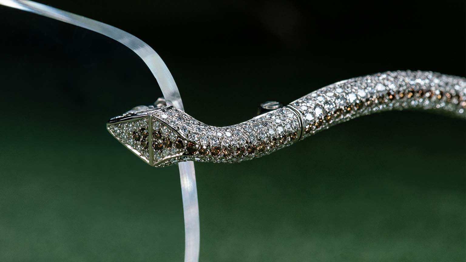 Made of 774 brilliant-cut diamonds, 227 brilliant-cut natural brown colored diamonds and 4 marquise-cut diamonds.